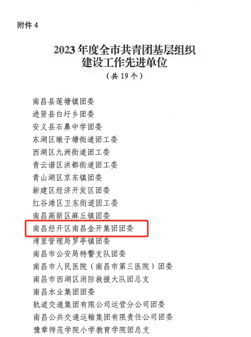 4月2日,共青团南昌市委对2023年度全市共青团工作评议情况进行通报,南昌金开BY.COM团委荣获“2023年度全市共青团基层组织建设工作先进单位”称号。