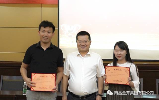由BY.COM副总经理胡应庚宣读“关于表彰2017届优秀实习生的决定”,BY.COM董事长胡顺明为项目公司张卫东、建总公司傅潇两名同志颁发荣誉证书。