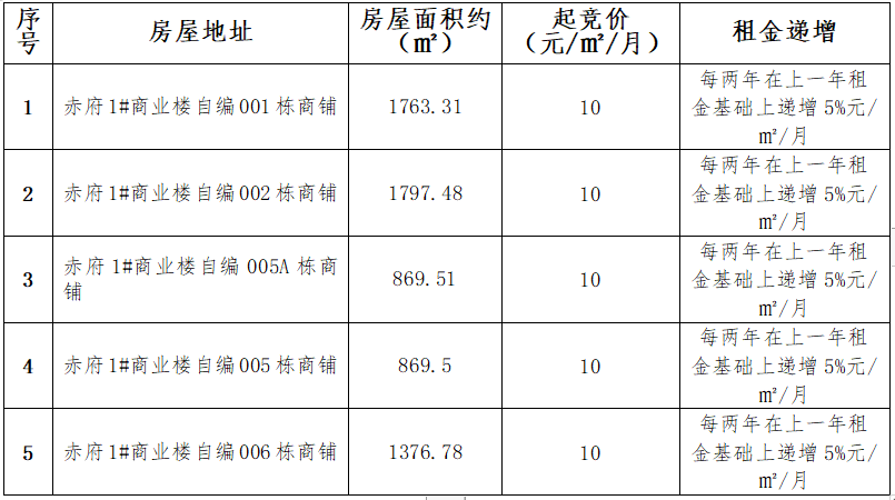 三、本次竞拍只报起竞价,房屋每栋租金起竞价为: