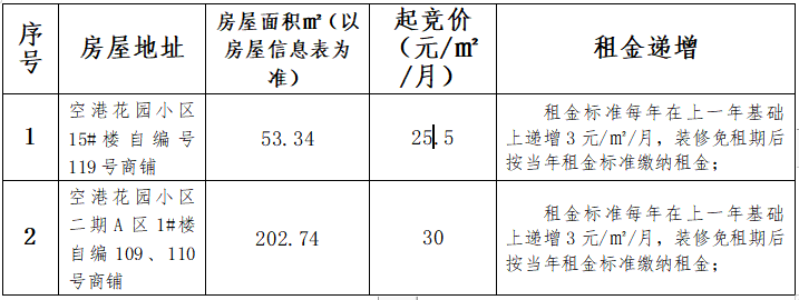 二、本次竞拍采用有底价、有声竞拍的形式。竞拍开始后,首次叫价为增幅后报价(即119号商铺不低于26元/平方米/月,109、110号不低于30.5元/平方米/月),每次报价增幅最低不低于0.5元/平方米/月的整倍数,如出现竞拍人仅举牌不叫价情况,即默认为在上一轮叫价基础上增加0.5元/平方米/月,否则应价无效。当最高价(超过底价)未有人追加竞价时,主拍人对该价重复三次报价,第三次重复报价无人应价,由主拍人宣布成交。本次竞拍取达到底价的最高报价人作为中标人,中标人若放弃中标人权力,不按排名顺延中标人,我司将做废标处理。
