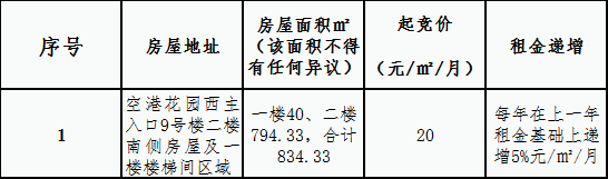 备注:(1)本次招租房屋涉及电表,水表、燃气等需中标人或直接委托人自费自行开户(包括材料及施工费用),房屋以现状出租,涉及一切维修改造工程产生的费用(包括但不限于房屋漏水、玻璃破损等)均由中标人自行承担,消防报建及其它审批手续中标人自行办理。