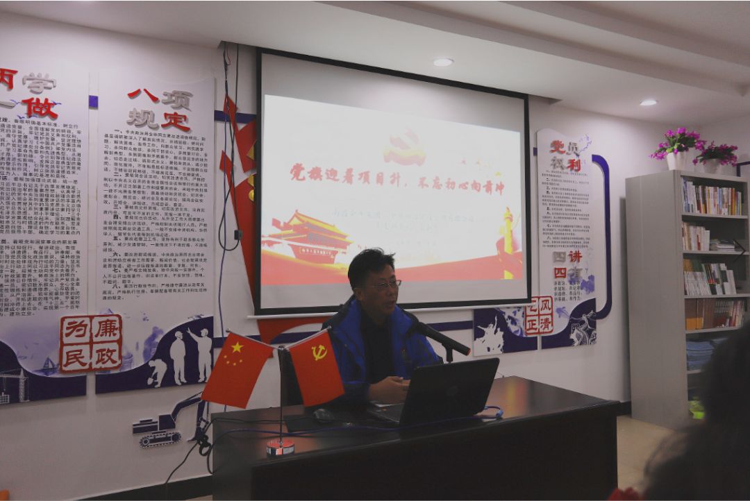 随后,共建党支部召开第一次会议。会上,双方共同审议通过了共建党支部党员先锋岗名单;并由袁扣华为大家带来了一堂主题为“党旗迎着项目飘 不忘初心向前冲”的党课。