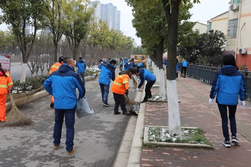当天,在领取铁锹、扫把等清扫工具后,胡顺明、潘贤林等干部职工们全力投入到卫生清理工作中,整个打扫场地一片热火朝天的景象。经过两个多小时的清扫,洪城锦苑社区、军民友谊路等地路面杂物及残雪被清理干净。