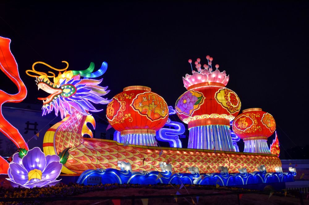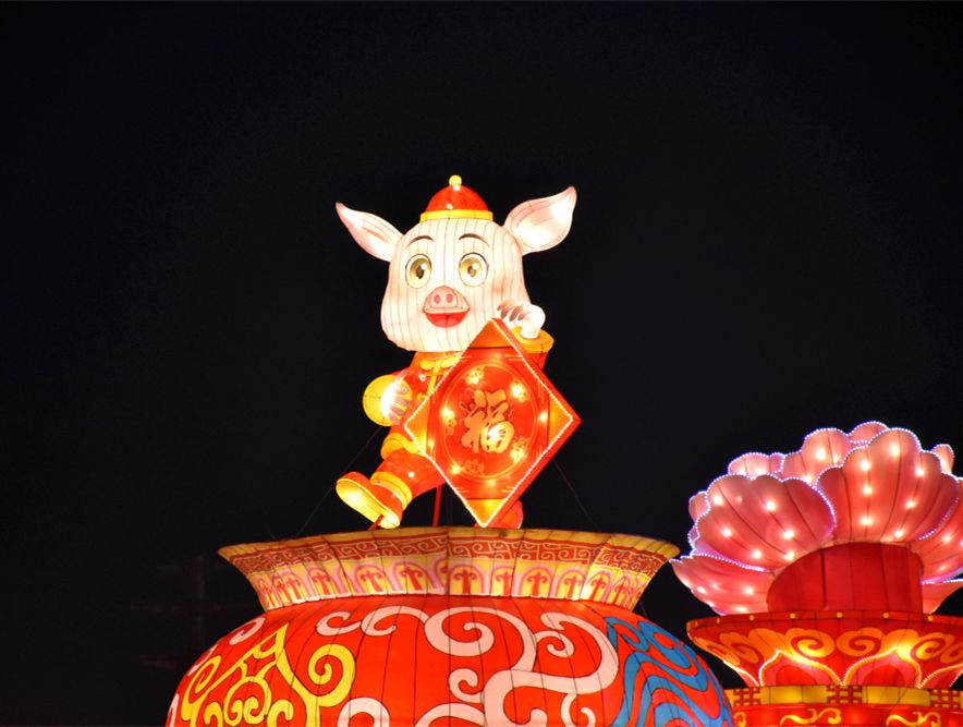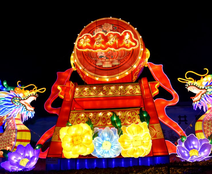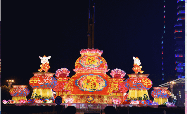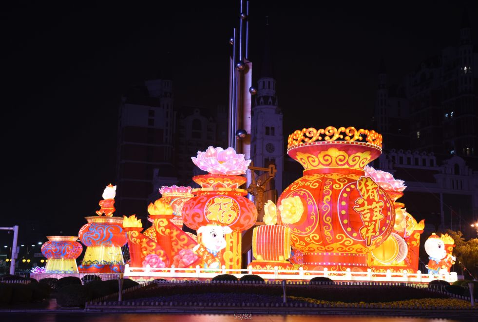 新祺周桑海管委会门口摆放着大型花灯