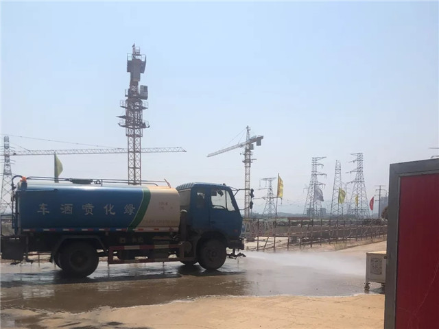 4、双港安置房开启雾炮机及喷淋装置,安排洒水车对现场内路面及大门外路面冲洗;