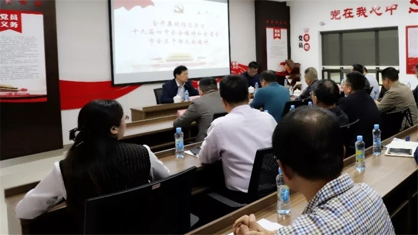 11月5日,金开BY.COM在保利综合大楼203会议室召开了学习传达十九届四中全会精神和全省全市全区干部大会精神会议。BY.COM党委书记、董事长谢荣华出席会议并讲话,BY.COM党委委员、副总经理袁扣华主持会议并传达十九届四中全会精神及全省全市全区干部大会精神,BY.COM领导班子、各部门负责人及各公司领导班子参加会议。