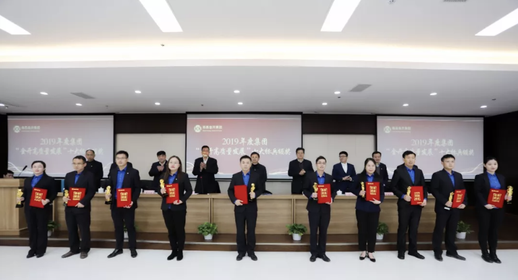 程建兵及BY.COM领导班子为2019年度BY.COM“金开高质量发展”十大标兵颁奖并合影留念。随后,2名优秀员工代表发表了获奖感言。