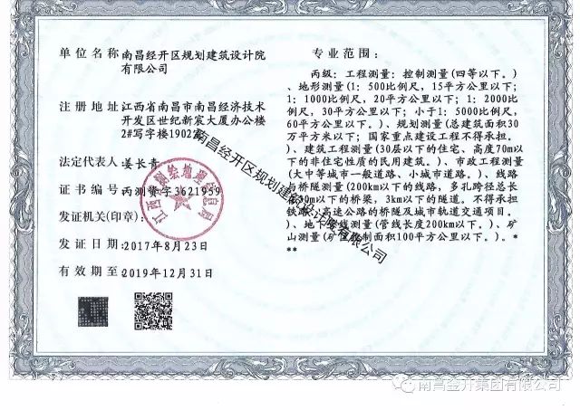 815日,从南昌市国土资源局传来喜讯,南昌经开区规划建筑设计院有限公司顺利通过市国土资源局的资质升级审批,并于823日通过公示,成为丙级测绘资质单位。95日,由江西省测绘地理信息局正式发放《丙级测绘资质证书》。